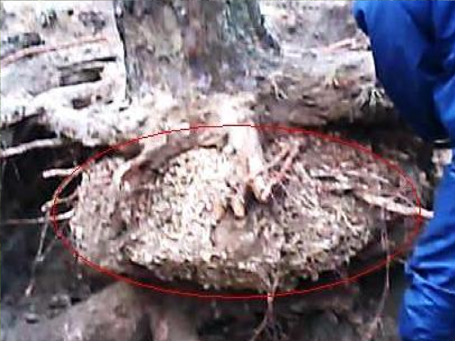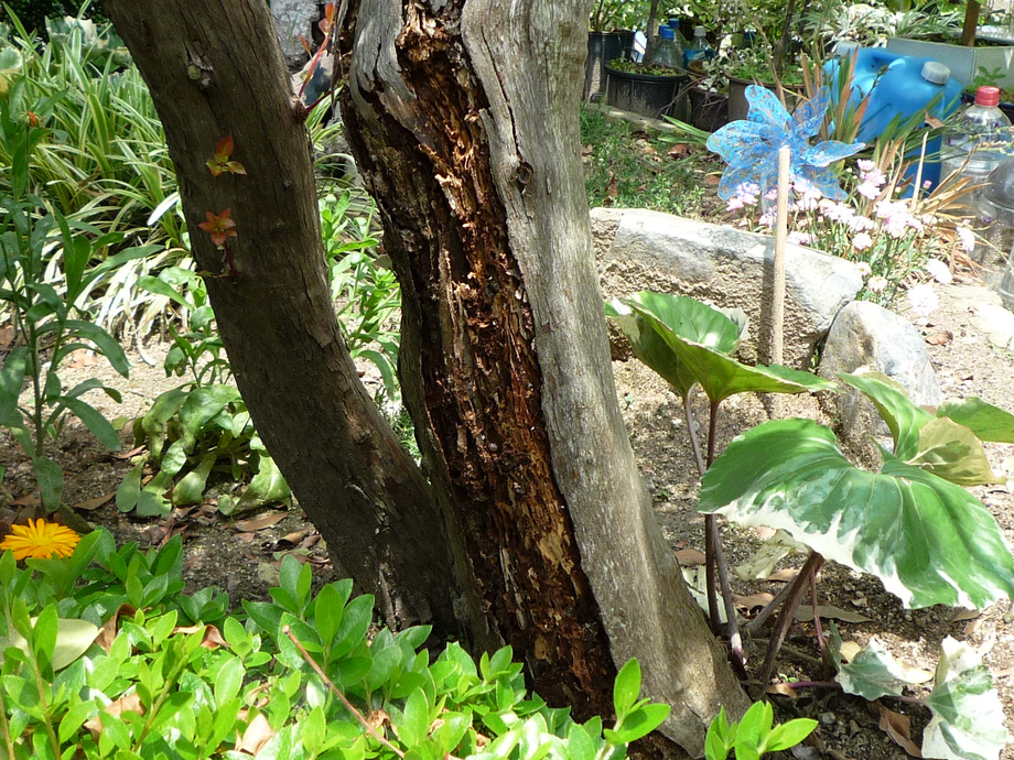 上圖為白蟻入侵後的情況,樹木的白蟻防治有幾總方法,灌注藥劑法及誘餌餵食抑制生長劑。但樹木裡的白蟻本身就是居住在地利的環境,不管是濕度還是食物都是取之不盡用之不竭,相對的在防治上更是難上加難,嚴重的情況為上圖(右邊)需挖掘至部由外部入侵去除巢穴。